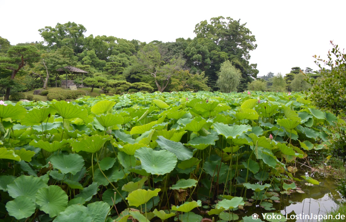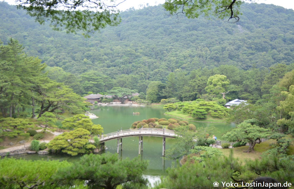 Weiter ging es zum Ritsurin Koen (栗林公園), einen wirklich wunderschönen und riesigen Park mit ganz viel Grün und Wasser (was wieder Mücken bedeutete) und vielen schönen japanischen Landschaften. Zu meiner Überraschung habe ich beim Einlass sogar eine Übersichtskarte auf Deutsch (!!) bekommen. Damit hatte ich nun gar nicht gerechnet.