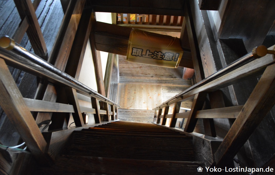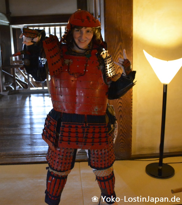 Die Burg an sich war sehr interessant. Es gab wie üblich viele Ausstellungsstücke und man musste u.a. die alten Holztreppen hinauf und hinab steigen. Mein persönliches Highlight war, dass man sich an einer Stelle selbst eine Samurai-Rüstung anziehen konnte. An der Wand war eine Anleitung zum Anziehen abgebildet und so habe ich mit meinem Freund versucht mich in einen Samurai zu verwandeln. Da die Rüstung wohl schon oft genutzt wurde, waren leider teilweise die Bänder zum Festschnüren arg gebraucht und nicht mehr sehr effektiv. Trotzdem hat das Ganze richtig viel Spaß gemacht. Nur leider waren die Lichtverhältnisse nicht so toll zum Fotografieren…