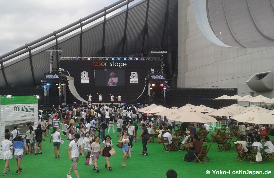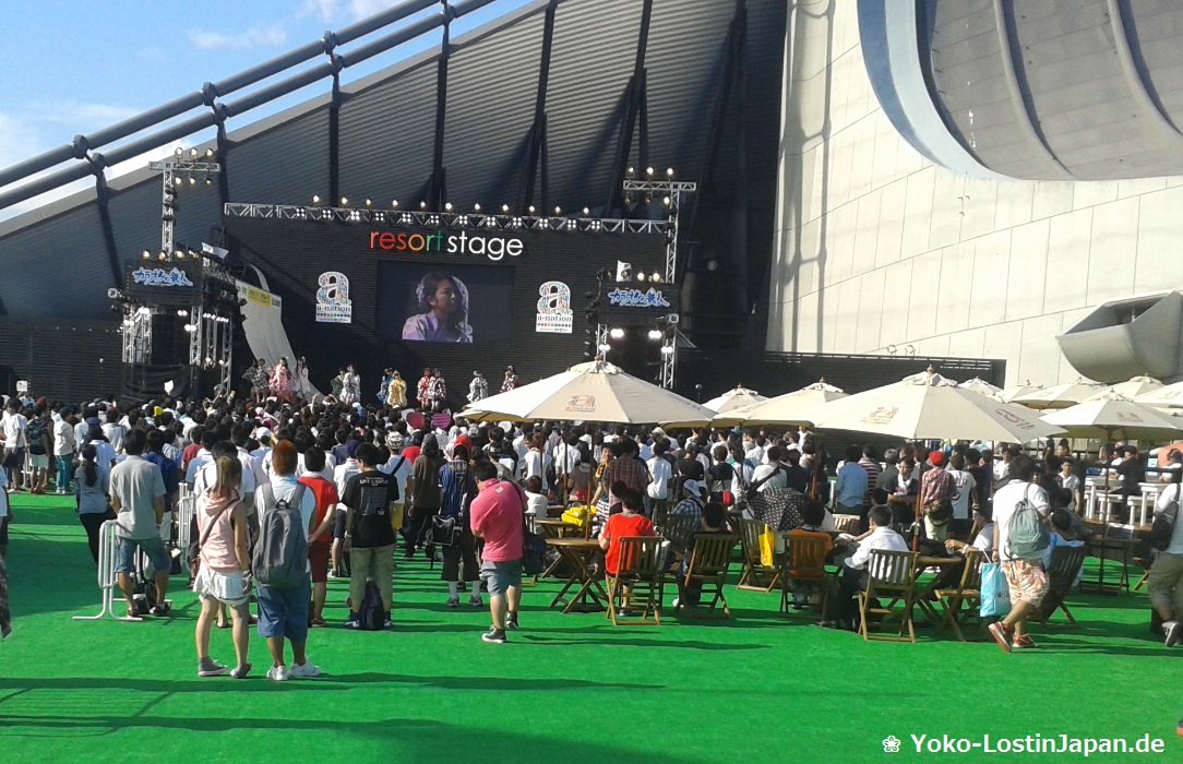 Während ich in Ruhe mein Eis aß, beobachtete ich die Resort Stage, auf der die ganze Zeit Programm gezeigt wurde. Gerade hüpften ein paar Girlgroups über die Bühne und sangen ihre J-Pop-Songs. Ganz niedlich und quietschig. Das Phänomen der japanischen Girlgroups ist echt interessant – man kann kaum zählen, wie viele es davon gibt. Und alle haben ihre Anhänger. Ich erinnere mich gerade mal an das Hello!-Projekt mit Morning Musume und ein paar anderen Untergruppen oder AKB48. Aber wahrscheinlich muss man mehr in der Szene drin sein, um den Hype darum zu verstehen. Am lustigsten waren für mich allerdings die männlichen Fans, die enthusiastisch vor der Bühne herum sprangen und die jungen Mädels anfeuerten. Ein kleines Video findet ihr hier auf meiner Facebook-Seite.