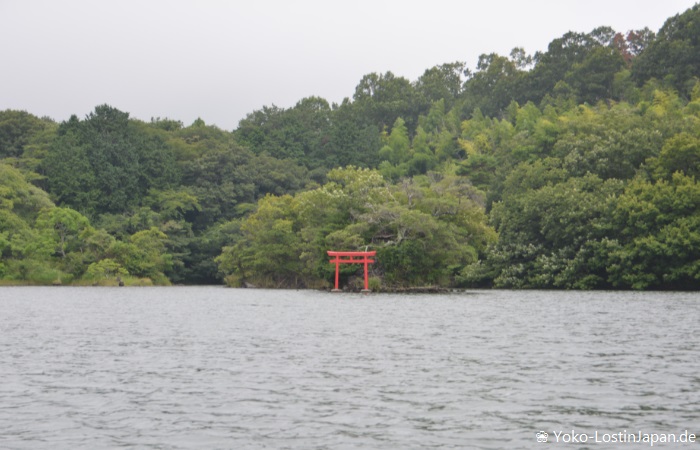 Unseren zweiten Stopp legten wir am Ippekiko ein, ein See, der auch als „Auge von Izu“ bekannt ist. Bei schönem Wetter ist es dort sicher sehr idyllisch, bei unserem Nebelwetter eher weniger. Trotzdem blieben wir dort und – da wir ja das Geld für die Bootstour am Tag zuvor gespart hatten, nutzen wir dieses jetzt für eine halbe Stunde Tretbootfahrt auf dem See. Dabei konnten wir nah an das Torii auf einer kleinen Insel heran fahren und haben auch noch jede Menge Enten gefüttert. Spaß hat das Ganze alle Mal gemacht.